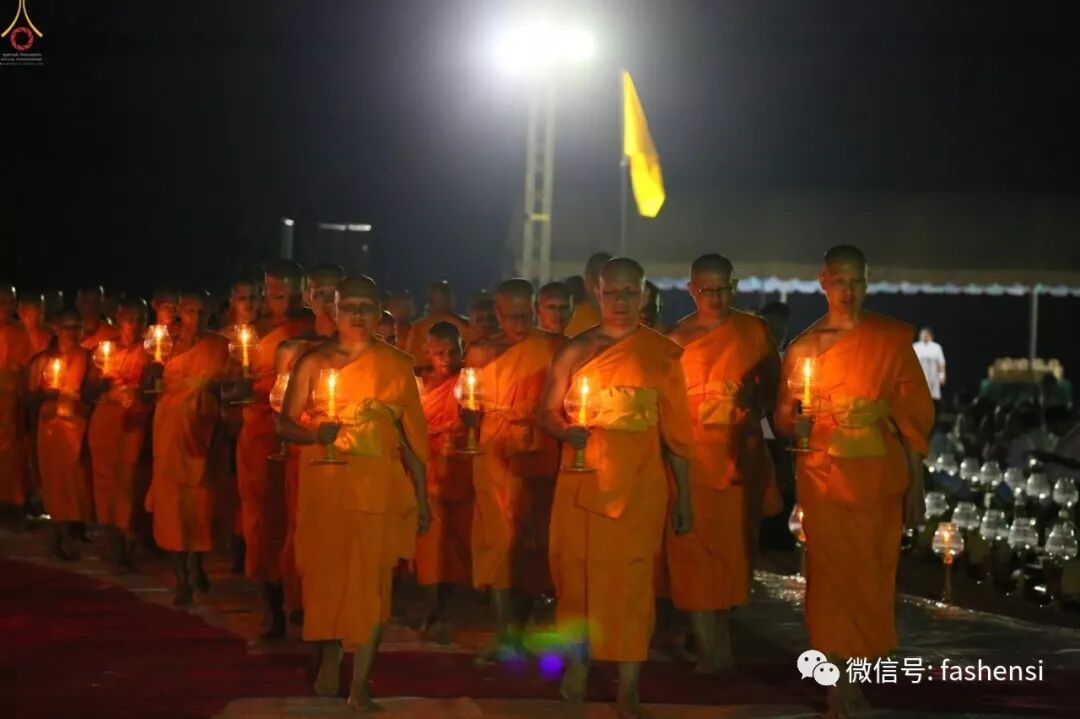 每人都将在自己面前的灯点燃之后,全体僧众和信众一起诵念吉祥经、初转法轮经,在泰南地区的上空回荡着洪亮的诵经声。